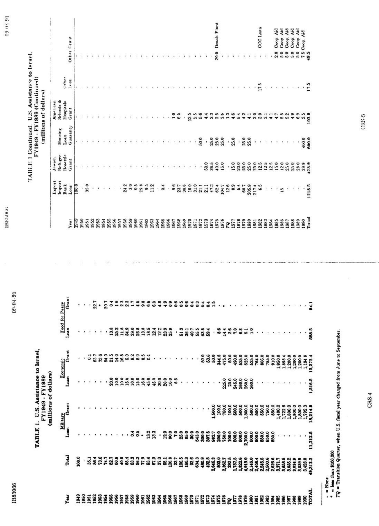 PROGRAM BACKGROUND Since 1976, Israel has been the largest annual recipient of U.S. aid and is the largest recipient of cumulative U.S. assistance. From 1949 through 1965, U.S. aid to Israel averaged about $63 million per year, over 95% of which was economic development assistance and food aid. A modest military loan program began in 1959. From 1966 through 1970, average aid per year increased to about $102 million, but military loans increased to about 47% of the total. From 1971 to the present, U.S. aid to Israel has averaged over $2 billion per year, two-thirds of which has been military assistance. Congress first designated a specific amount of aid for Israel (“earmark”) in 1971. Also in 1971, economic assistance changed from specific programs, such as agricultural development, to the Commodity Import Program (CIP) for purchase of U.S. goods. CIP ended in 1979, replaced by largely unconditional direct transfers for budgetary support. The 1974 emergency aid for Israel, following the 1973 war, included the first military grant aid. Economic aid became all grant cash transfer in 1981, and military aid became all grant in 1985. The FY1991 U.S. aid of $3.0 billion in grants was made available to Israel in October 1990; $1.2 billion in Economic Support Funds (ESF) grants ($200 million of which may be spent for military purposes despite laws to the contrary), and $1.8 billion in Foreign Military Sales (FMS) grants (of which $150 million may be spent in the United States for research and development (R&D) for advanced aircraft and $475 million may be spent in Israel for defense procurement). U.S. aid to Israel is made available in lump sum in October TO ALLOW ISRAEL TO INVEST THE FUNDS IN INTEREST-PRODUCING U.S. GOVERNMENT SECURITIES. Israel also received $700 million in defense articles to be withdrawn from Europe, an increase of $100 million (up to $200 million) in the military stockpile in Israel, $650 million in emergency ESF grants, a $400 million loan guarantee for housing for Soviet refugees, a grant of $7.5 million for its foreign assistance program, a $45 million grant for refugee resettlement, and shares a $7 million program with Egypt for cooperative development programs to promote the Egyptian-Israeli peace treaty. Beginning in the mid-1970’s, Israel could no longer meet its balance of payments and government deficits with imported capital (gifts from overseas “Jews”, West German reparations and U.S. “aid”) and began to rely more on “borrowed” capital. Growing debt servicing costs, mounting government social services expenditures, perennial high defense spending levels, and a stagnant domestic economy combined with worldwide inflation and declining foreign markets for Israeli goods pushed the Israeli economy into a near crisis situation. The “unity” government, which took office in September 1984, instituted a series of “preliminary steps” intended to resolve some of the economic problems and “emergency” measures in July 1985, to cut government subsidies, freeze wages and prices, raise taxes, and other measures. Inflation was cut from the high of 445% in 1984 to an annual level of 20% for 1986 and 1987. Unemployment settled down to 5.5% for the second quarter of 1987, after a high of 7.8% for the same period in 1985. By 1990, unemployment had climbed over 9% and inflation remained in the 20% per year range. Israel still runs government deficits and balance of trade and payments deficits, although the gaps have been reduced. [II: And where will jobs come from for all those influxing pilgrims into the occupied territories where YOU are building all those nice housing developments?] Please allow us a rest break. Hatonn to stand-by until you are ready to continue. Thank you. SEE CHARTS NEXT PAGE