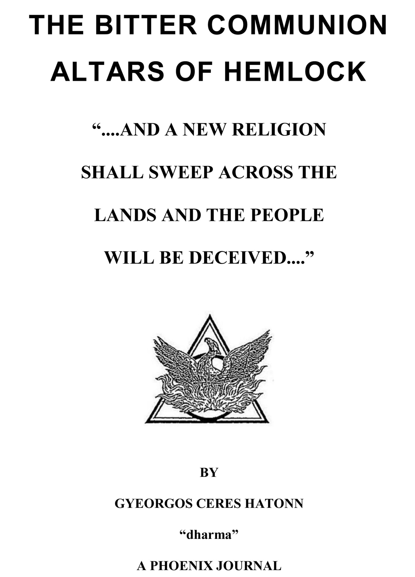 COPYRIGHT POSITION STATEMENT AND DISCLAIMERThe Phoenix Journals are intended as a “real time” commentary on current events, how current events relate to past events and the relationships of both to the physical and spiritual destinies of mankind. All of history, as we now know it, has been revised, rewritten, twisted and tweaked by selfishly motivated men to achieve and maintain control over other men. When one can understand that everything is comprised of “energy” and that even physical matter is “coalesced” energy, and that all energy emanates from God’s thought, one can accept the idea that the successful focusing of millions of minds on one expected happening will cause it to happen. If the many prophecies made over thousands of years are accepted, these are the “end times” (specifically the year 2000, the second millennium, etc.). That would put us in the “sorting” period and only a few short years from the finish line. God has said that in the end-times would come the WORD--to the four corners of the world--so that each could decide his/her own course toward, or away from, divinity--based upon TRUTH. So, God sends His Hosts--Messengers--to present that TRUTH. This is the way in which He chooses to present it, through the Phoenix Journals. Thus, these journals are Truth, which cannot be copyrighted; they are compilations of information already available on Earth, researched and compiled by others (some, no doubt, for this purpose) which should not be copyrighted. Therefore, these journals are not copyrighted (except SIPAPU ODYSSEY which is “fiction”). The first sixty or so journals were published by America West Publishing which elected to indicate that a copyright had been applied for on the theory that the ISBN number (so necessary for booksellers) was dependent upon the copyright. Commander Hatonn, the primary author and compiler, insisted that no copyrights be applied for and, to our knowledge, none were. If the Truth is to reach the four corners of the world, it must be freely passed on. It is hoped that each reader will feel free to do that, keeping it in context, of course. THE BITTER COMMUNION ALTARS OF HEMLOCK “....AND A NEW RELIGION SHALL SWEEP ACROSS THE